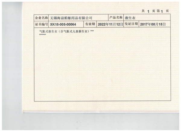 無錫海益船舶用品有限公司是船舶救生設(shè)備的專業(yè)生產(chǎn)企業(yè),地處江蘇省無錫市,屬長江金三角腹地。主要生產(chǎn)氣脹式救生衣,三片式救生衣等各種救生設(shè)備,示位燈、信號(hào)設(shè)備、救生艇筏屬具及其它船舶配件。公司產(chǎn)品已越來越受世界各國用戶的青睞。